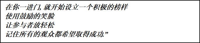 星期一早上的培训:设置好培训室,位置安排,投影设备,等。至少提前15分钟准备好所有的事情,这样你就可以在学员进入时欢迎他们。