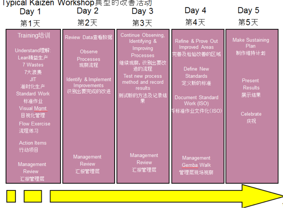 改善活动是一个快速的改进活动,需要一个跨部门的团队进行参与,一般情况下是5天时间,在这个改善活动当中团队将遵循PDCA的循环来观察生产过程,找出浪费,测试想法及标准化,来改进方法。